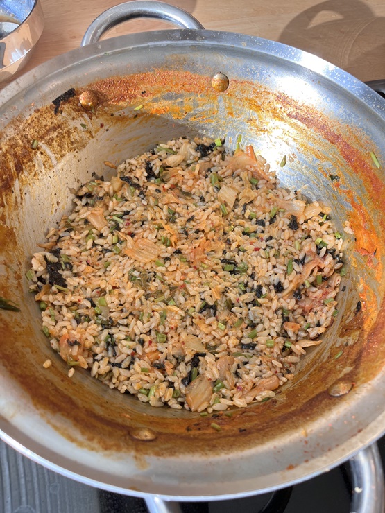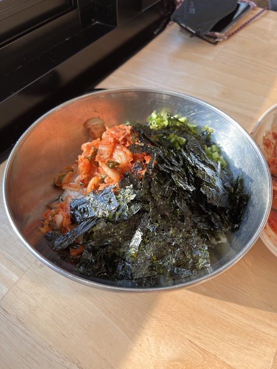 김치, 미나리, 김, 밥으로 구성된 볶음밥 재료.