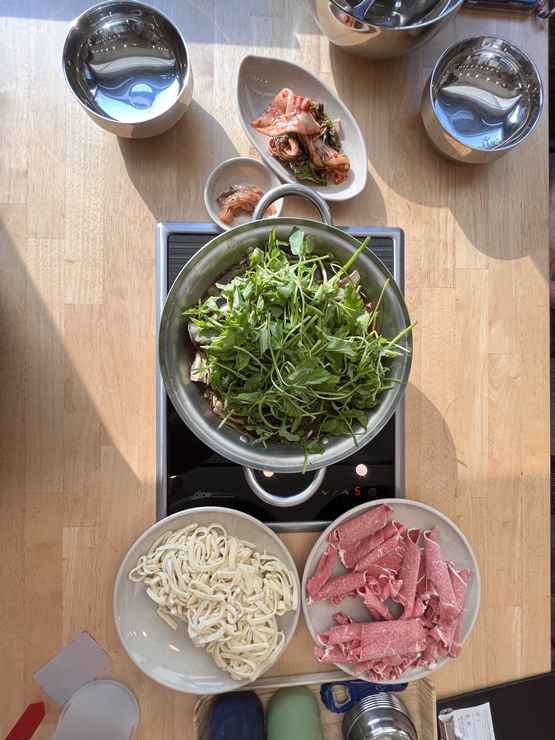 버섯과 미나리를 기본으로 고기, 칼국수, 그리고 나중에 볶음밥이 나왔다.
