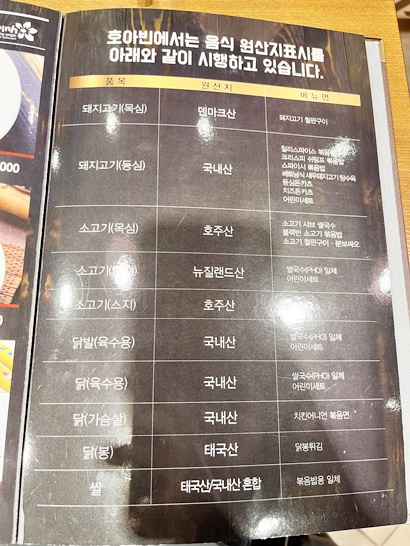메뉴에 들어가는 품목에 대한 원산지 표기.